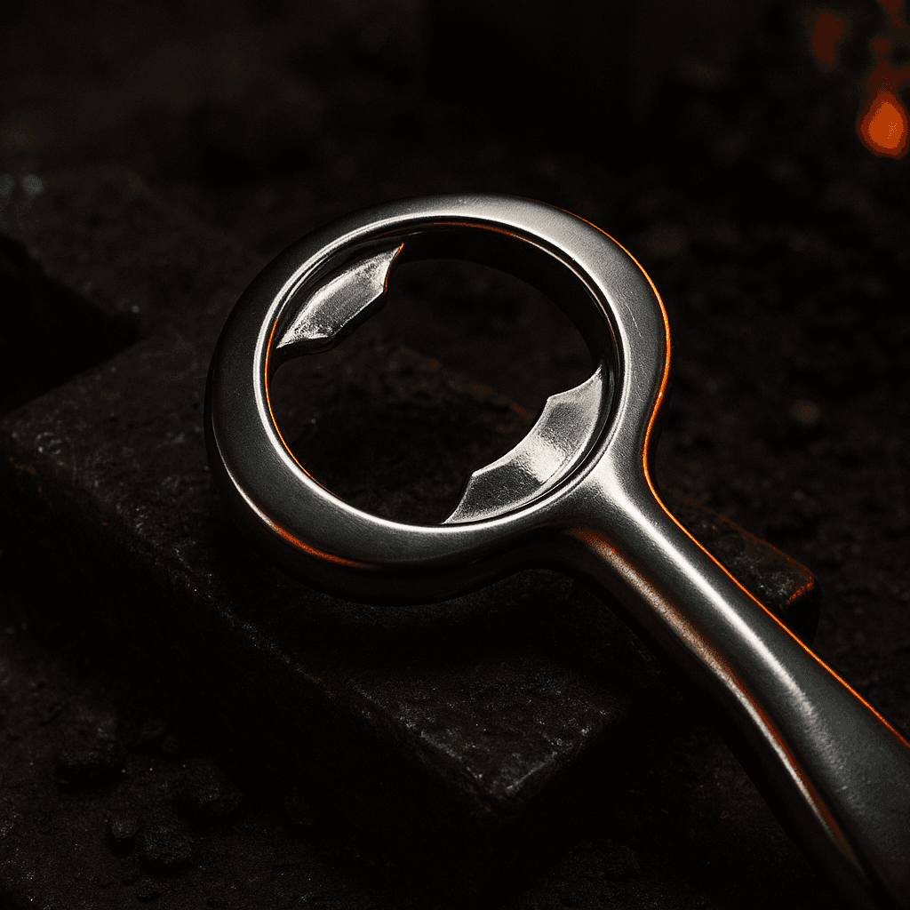 The business end of The Enforcer. Machined from solid steel and forged for repeatable, crisp cap release. Overbuilt on purpose, because popping a cold one should feel as good as landing a clean hit.